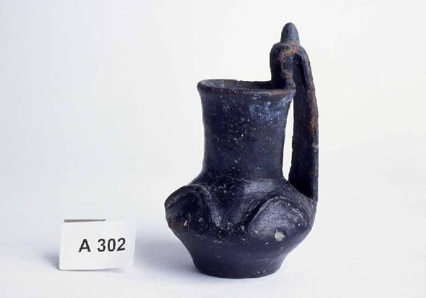 Corpo biconico apodo con alto collo cilindroide, ansa a nastro con applicazione plastica a bugnetta conica all'attacco. Decorazione impressa a cerchi e cordoniature circolari sul corpo.