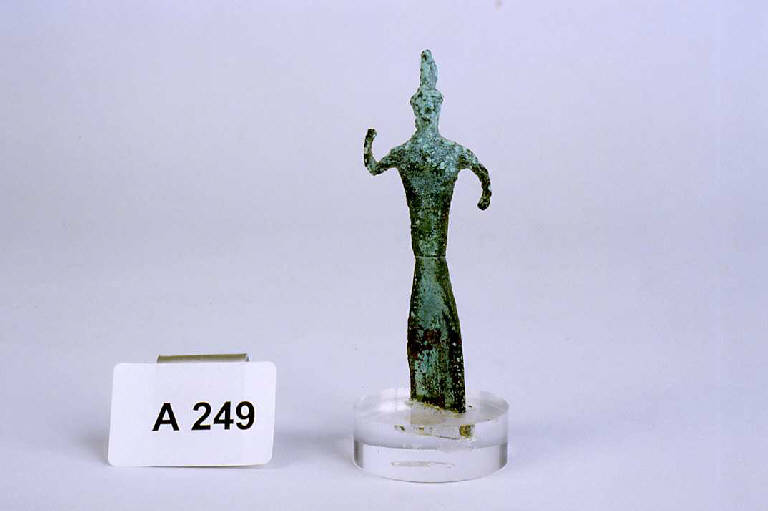 Statuetta di Athena elmata in posizione d'attacco con gamba sinistra avanzata e braccio destro alzato a reggere la lancia. Trattamento schematico.