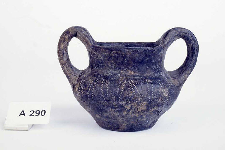 Corpo apodo globulare, collo a profilo lievemente concavo, anse a bastoncello sormontanti impostate verticalmente dall'orlo. Decorazione impressa a tratteggi obliqui sul corpo.