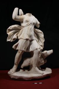 - NOTIZIE STORICO CRITICHE Emersa dai recenti scavi di piazza Marconi, la statuetta faceva parte degli arredi della lussuosa domus del Ninfeo ed era collocata, forse, proprio in una delle nicchie della scenografica fontana. I materiali relativi a questo edifcio sono stati recuperati negli strati di crollo delle stanze o nei riempimenti e livellamenti seguiti all'incendio del 69 d.C., quando Cremona fu messa a ferro e fuoco dalle truppe di Vespasiano. Ciò che rimase, perchè risparmiato dal saccheggio dei soldati, è, comunque, segno evidente dell'alto tenore di vita degli abitanti della casa. Data la preziosità dei materiali e l'adesione alle mode vigenti a Roma, evidente negli arredi, è stato proposto di riconoscere nel capofamiglia un personaggio di rango senatorio.