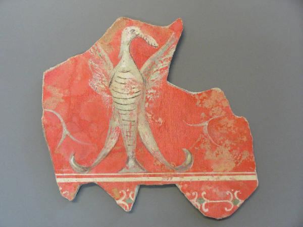 - NOTIZIE STORICO CRITICHE Emerso dai recenti scavi di piazza Marconi, il frammento decorava la parete di uno degli ambienti della lussuosa domus del Ninfeo, assegnabile alla fase augustea, dalla quale provengono anche la statuetta di Artemide e il trapezoforo. I materiali relativi a questo edificio sono stati recuperati negli strati di crollo delle stanze o nei riempimenti e livellamenti seguiti all'incendio del 69 d.C., quando Cremona fu messa a ferro e fuoco dalle truppe di Vespasiano. Ciò che rimase, perchè risparmiato dal saccheggio, è, comunque, segno evidente dell'alto tenore di vita degli abitanti della casa. Data la preziosità dei materiali e l'adesione alle mode vigenti a Roma, evidente negli arredi, è stato proposto di riconoscere nel capofamiglia un personaggio di rango senatorio.