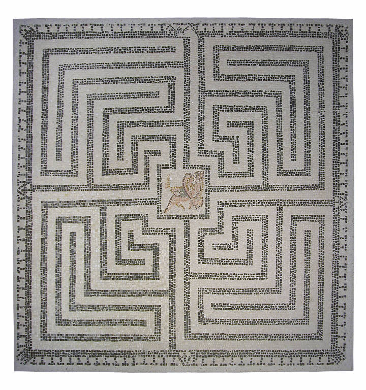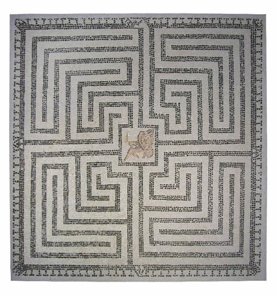 Mosaico recante un labirinto in tessere bianche e nere, distinto in quattro settori; al centro, emblema in tessere policrome con la raffigurazione del Minotauro morente.