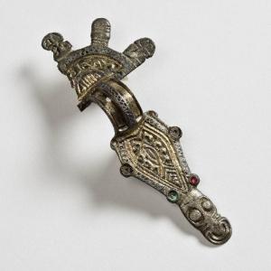 Fibula del tipo a staffa, con piastra semicircolare circondata da cinque elementi a bottone, di cui solo tre sono conservati. Piede romboidale con quattro castoni, terminante a testa di animale allungata e stilizzata Il corpo della fibula è ornato da motivi decorativi a Kerbschnitt.