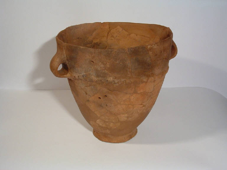Vaso troncoconico biansato a impasto grossolano; piede a tacco; sotto le anse, cordone impresso a rilievo decorato a bugne; sono presenti quattro fori di riparazione praticati in antico.