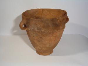 - NOTIZIE STORICO CRITICHE Tra le forme vascolari tipiche della cultura del Vho si annoverano anche i vasi troncoconici a due anse, spesso decorati con cordoni a rilievo. Non è chiaro quale fosse il loro preciso utilizzo, ma considerate le dimensioni e l'impasto grossolano con cui erano prodotti, sembra probabile che servissero per la preparazione dei cibi e il contenimento dei liquidi.\nIl vaso, parzialmente ricomposto, proviene dal pozzo XVIII di Campo Ceresole.