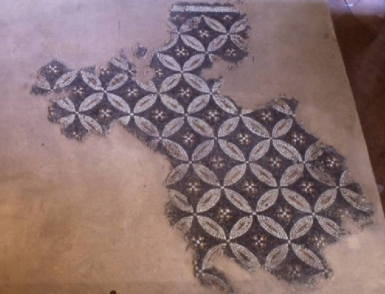 Frammenti di un mosaico pavimentale a pannelli geometrici giustapposti. La reale estensione dell'ambiente in cui si trovava il mosaico non è nota. Il frammento a cerchi allacciati faceva parte del pannello mediano, delle dimensioni stimate di 6x6 m. ca. Su fondo nero, presenta, al centro dell'intersezione dei cerchi, un motivo cruciforme a tessere bianche e rosse. Il settore è racchiuso in una cornice con alternanza di tondi e volute a S. Sul lato meridionale, uno dei frammenti della cornice prosegue verso sud con un motivo a pelte facente parte della decorazione di un secondo pannello. A sinistra di questo pannello, inizia forse un altro pannello, in cui compare un rombo di grandi dimensioni. Un ulteriore frammento, collocabile nell'angolo nord-est e appartenente a un nuovo pannello, presenta elementi esagonali disposti a formare ottagoni intersecati.