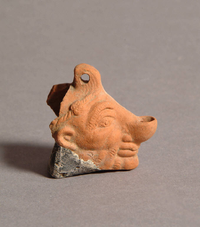 Corpo configurato a testa maschile dai lineamenti grotteschi, barbata e diademata; foro di alimentazione all'apice del naso, ansa verticale forata al vertice della testa
