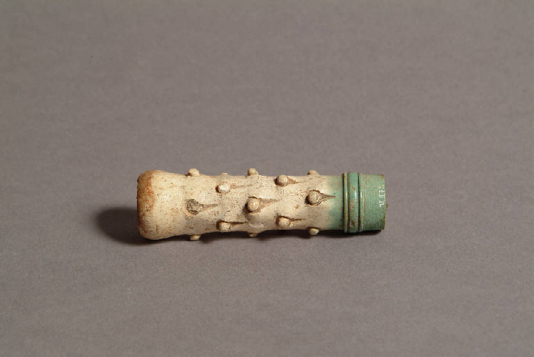 Di forma cilindrica terminante con due solcature che delimitano un toro; parte centrale decorata con piccole sporgenze a "clava di Ercole"
