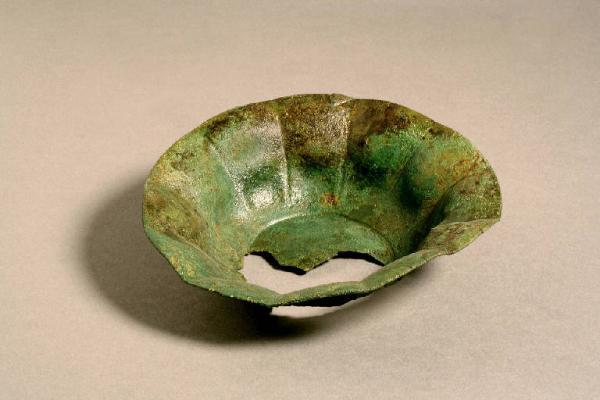 Orlo estroflesso, arrotondato ed ondulato; vasca a pareti ondulate con baccellature rivolte verso l'interno, fondo piano