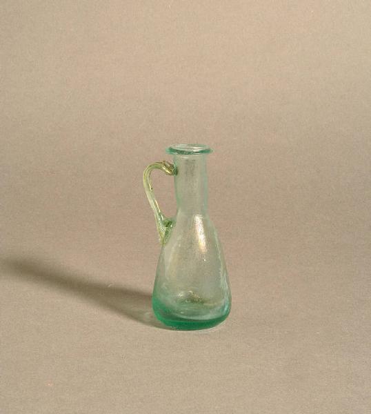 Orlo estroflesso ingrossato, collo cilindrico, corpo conico, ansa a nastro accartocciato, apodo