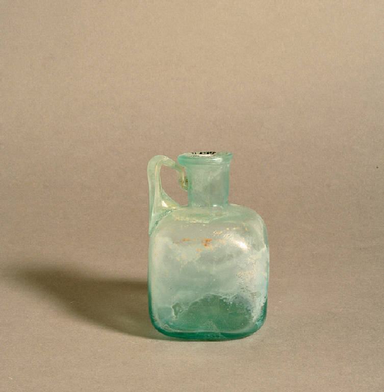Orlo leggermente estroflesso, ingrossato, collo cilindrico, spalla arrotondata, corpo cubico, ansa a nastro accartocciato, fondo piano con cerchi concentrici impressi