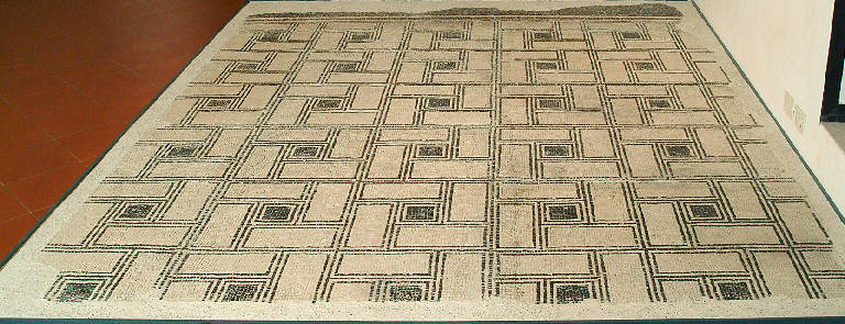 Frammento di mosaico pavimentale geometrico a rettangoli bianchi contornati di nero e quadrati neri con contorno bianco