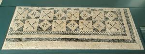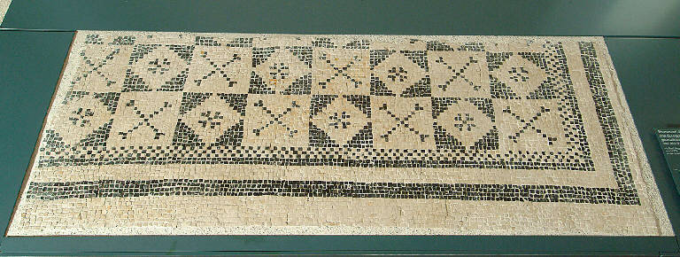 Frammento angolare di pavimento a mosaico, bicromo, con quadrati a tessere nere che racchiudono losanghe bianche e motivo decorativo centrale nero e quadrati bianchi con motivo a X nero