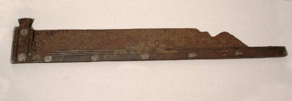 Lamina angolare sagomata che presenta la stessa decorazione sui due lati, composta di: un listello liscio seguito da una modanatura digradante, formata da un cavetto e una gola rovescia; sul lato minore, da una parte la decorazione si presenta completa, dall'altra non è finita; un foro rettangolare di fissaggio è visibile nel fianco di questo lato, che termina inferiormente con un doppio taglio ad angolo acuto; la parte centrale è occupata da una lastra sottile, che presenta un taglio sottile ad S, probabilmente dovuto ad un successivo reimpiego