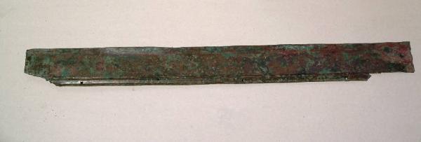 Frammento con superficie liscia e quattro fori lungo il bordo modanato