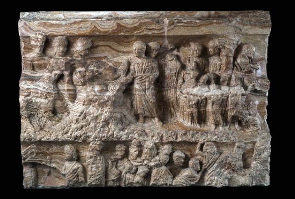 Lastra rettangolare scolpita divisa in due registri da una fascia centrale aggettante.