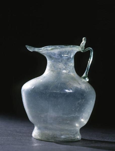 Orlo a cordoncino sagomato a becco d'anatra; corto collo cilindrico, corpo sferico su base leggermente concava, piede espanso, ansa a nastro impostata sulla spalla, piegata ad angolo retto e saldata sul labbro con una orecchietta