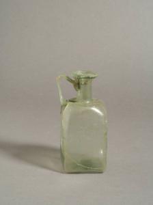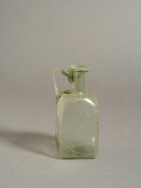 Orlo a cordoncino ripiegato, corto collo cilindrico, ventre cubico su base leggermente concava, ansa a nastro impostata sulla spalla, piegata ad angolo acuto e saldata con un ricciolo sotto l'orlo. Decorazione: otto raggi a rilievo sotto la base