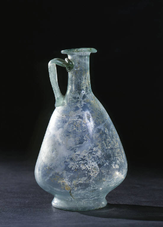 Orlo a cordoncino ripiegato, corto collo cilindrico, ventre piriforme abbassato su base concava, ansa a nastro impostata sulla spalla, piegata ad angolo e saldata sotto l'orlo, piede poco espanso