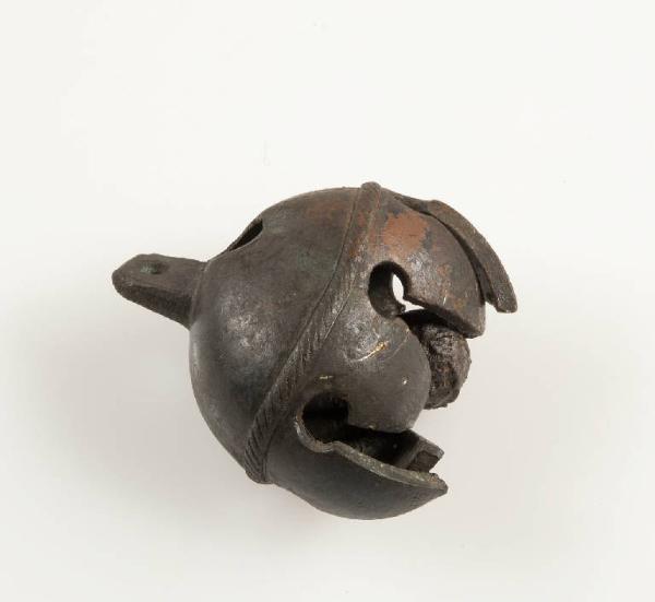 Corpo sferico con collarino decorato a incisioni trasversali a metà dell'altezza; la metà inferiore è sagomata a foglie lanceolate riunite presso la punta; all'interno sfera libera