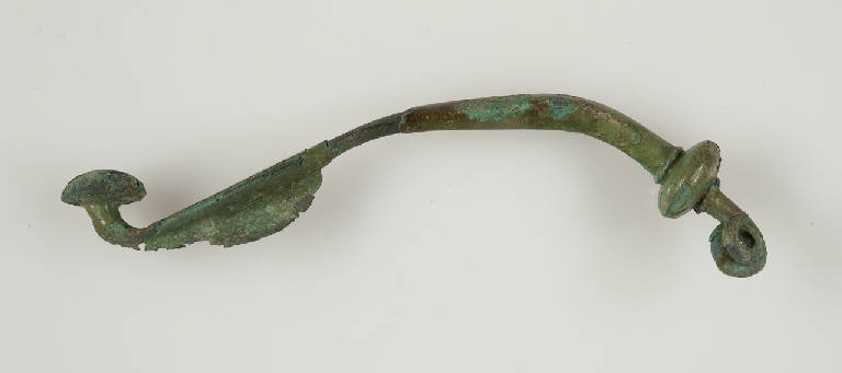 Arco asimmetrico a sezione biconvessa, con profilo a losanga e grosso globetto terminale, affiancato da due cordonature; molla a doppio avvolgimento; staffa a profilo trapezoidale con grossa capocchia. L'attacco dell'arco alla staffa è sottolineato da un motivo a V inciso