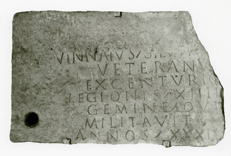 Porzione superiore sinistra di una lastra con testo epigrafico. E' visibile, anche se molto eroso, il bordo della cornice; in basso a sinistra foro di fissaggio
