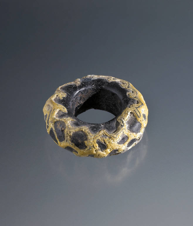 Verga blu a sezione circolare piegata a cerchio con foro rotondo. Decorazione: filamenti gialli applicati con motivo a reticolo