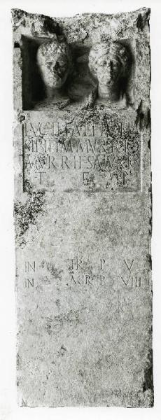 Il cippo presenta i lati lisci e solo la fronte decorata. In alto vi è un incavo rettangolare in cui sono inseriti i ritratti dei defunti. In corrispondenza dei quattro angoli della cassetta sono presenti fori rettangoli.