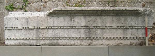 Blocco di architrave a tre fasce. Dall'alto: listello \nliscio alto 3 cm, gola rovescia con kyma lesbio (alt. 7,5 cm), fascia\nliscia (alt. 11,5 cm), astragalo con perle allungate e\nfusarole tondeggianti, fascia liscia (alt. 9 cm),\nastragalo a perline, fascia liscia (alt. 6,5 cm). Il blocco è inoltre predisposto per\nl'inserimento in una struttura ad immorsatura: dal\nmuro sarebbe sporta la parte anteriore su cui si\nestende la decorazione che prosegue sul lato destro per 10\ncm circa.