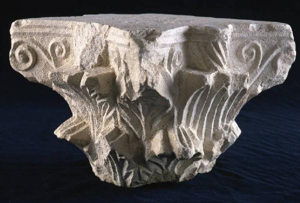 Capitello di colonnina corinzieggiante con due ordini di foglie a lobi concavi e sezione a V e terminazione appuntita. Il lato del capitello è occupato al centro da un gruppo di tre foglie allungate e con nervatura centrale a sezione triangolare; le volute sono sostenute da foglie uguale a quelle della prima corona. Elici e volute sono esili e contratte rispetto al resto della decorazione. Il flos abaci è sostituito da un elemento a semi cilindro con solcature a spirale. L'abaco è bipartito da un solco mediano.