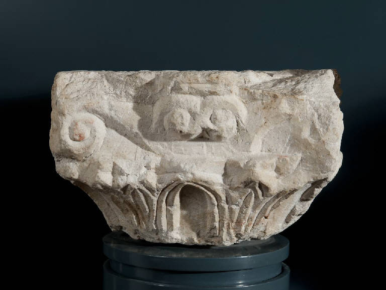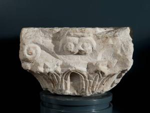 Frammento di capitello su cui si osserva una corona di foglie realizzate con lobi a sezione concava a V, molto profonda, e terminazioni a punta; Volute angolari ed elici centrali che si congiungono. L'abaco è bipartito.