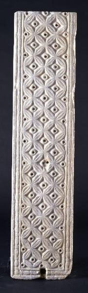 Frammento terminale di pilastrino per inserimento di un pluteo. Attorno corre una cornice ad astragali e fusarole, mentre il campo centrale è occupato da un modulo decorativo che dà origine ad un tappeto regolare di fiori quadripetali, ottenuto mediante l'inserzione di cerchi, e di perle forate negli spazi di risulta. Su uno dei fianchi sono i fori e le scanalature per l'inserimento di un pluteo o transenna