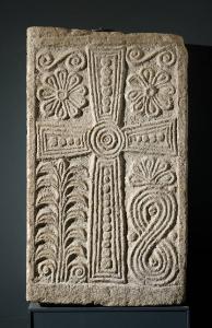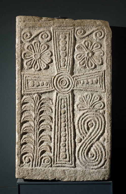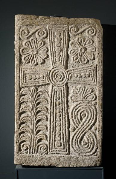 Pluteo rettangolare che sul fianco sinistro ha la scanalatura verticale per l'incastro di altra lastra che inizia poco sotto il limite superiore e scende fino in basso; sulla fronte ha ricca decorazione con croce che campeggia, a rilievo, e il retro non è lavorato. La decorazione della fronte è racchiusa entro breve cornice perimetrale liscia e aggettante; nel mezzo della superficie interna campeggia una grande croce latina a bracci lievemente espansi, modellata sul tipo delle croci auree barbariche alle quali si richiamano per il contorno formato da tre cordonature, per la presenza di perle nella treccia leggermente espansa, per le grandi gemme all'incrocio tra i bracci formato da dischetto centrale e da quattro cerchi concentrici. A fianco della croce, in alto, sono due rosette, una per lato, rispettivamente di otto e nove petali a doppio bordo e bottoncino centrale; sono sormontate da doppie volute ad "esse" poste orizzontalmente. In basso a destra, è una treccia di quattro capi viminei che si conforma ad "otto", sormontata da mezza rosetta a conchiglia e integrata da quattro gemme disposte a croce negli spazi liberi; a sinistra è una palma a foglie ripiegate a semicerchio con ricciolo iniziale e fogliette terminali