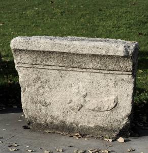 Blocco di architrave terminante in alto con una gola concava e sotto un listello. Sulla parte frontale la superficie è lavorata a gradina e vi è raffigurato un fallo a rilievo.