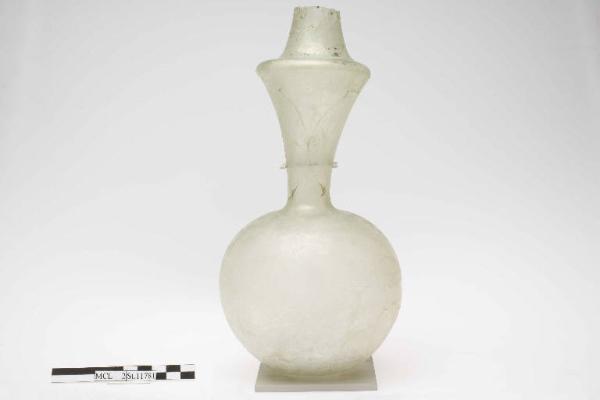 Ampolla vitrea con lungo collo svasato che presso l'orlo si allarga a formare una carenatura arrotondata, corpo sferoidale, fondo concavo.