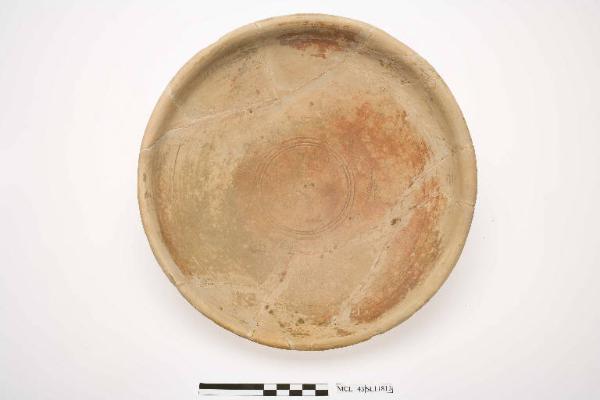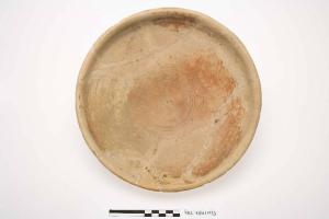 Patera in terra sigillata. Breve parete verticale con orlo arrotondato, vasca con all'interno solcature circolari, piede ad anello