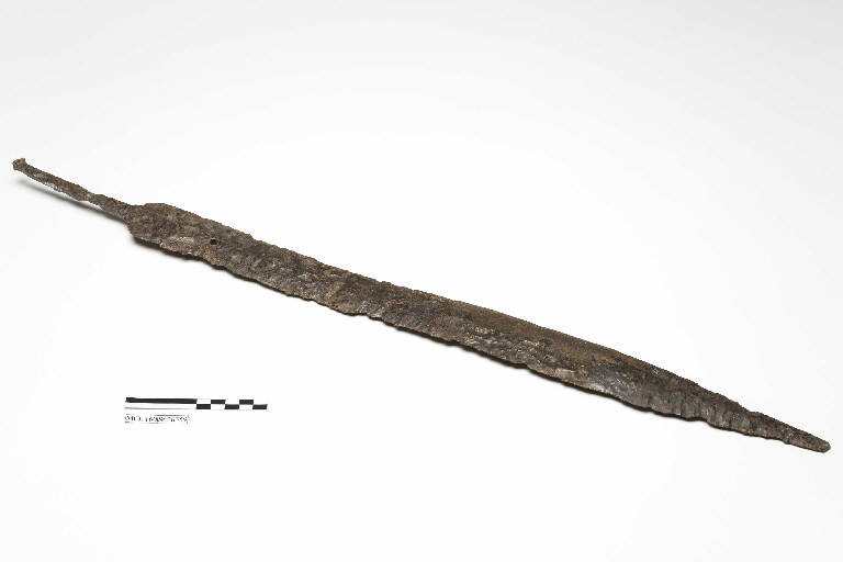 Spada in ferro con lama rastremata verso la punta e spalla arrotondata. Il codolo, a sezione rettangolare, è desinente in un bottone lenticolare e si dilata prima di congiungersi alla lama.