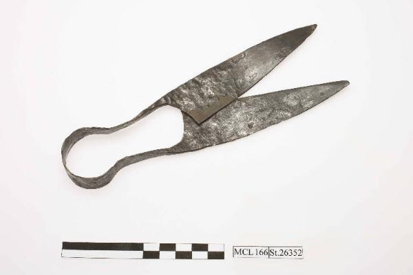 Cesoie in ferro con molla ad anello e lame larghe, lame a dorso leggermente arcuato.