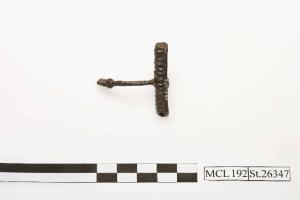 Fibula in ferro a molla bilaterale con corda esterna. Staffa ripiegata sull'arco alla cui estremità è fissata con un collarino.