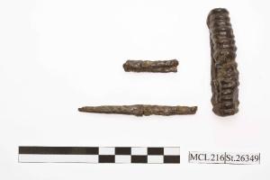 Frammenti di fibula in ferro con molla a doppio avvolgimento.