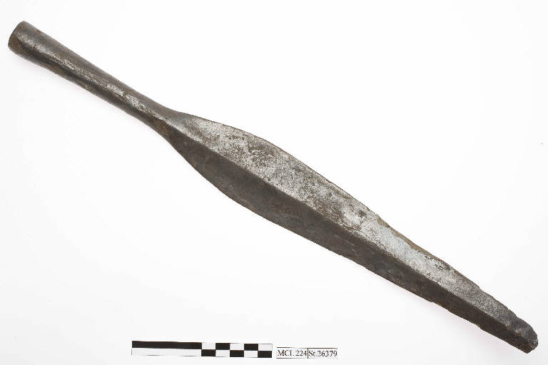 Cuspide di lancia in ferro con innesto a cannone e debole costolatura centrale. Il cannone reca alla base un foro per il fissaggio all'asta di legno.