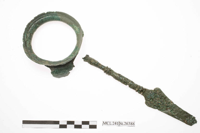 Frammento di mestolo in bronzo di tipo Pescate. Parte distale del manico che terminava in una testa schematica d'anatra, da cui partivano due sottili verghe in bronzo che la fissavano alla gola della coppa; di quest'ultima restano alcuni frammenti dell'orlo, della gola e delle pareti.