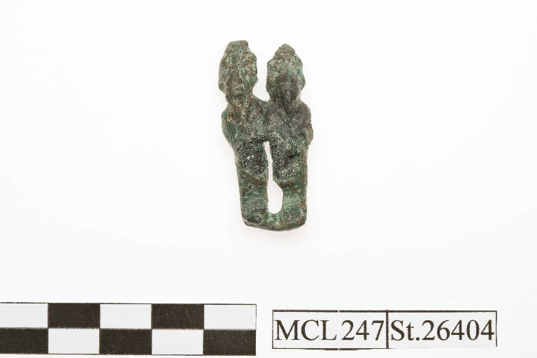 Frammento bronzeo con figurine stanti mitrate. Si tratta probabilmente di un'applique di recipiente.
