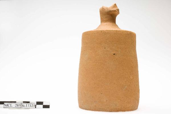 Olpe mutila dell'ansa, dell'orlo e di buona parte del collo. Corpo cilindrico con leggera strozzatura all'attacco con la spalla a formare una carenatura con spigolo vivo, fondo piano. La porzione di ansa conservata è nastriforme.