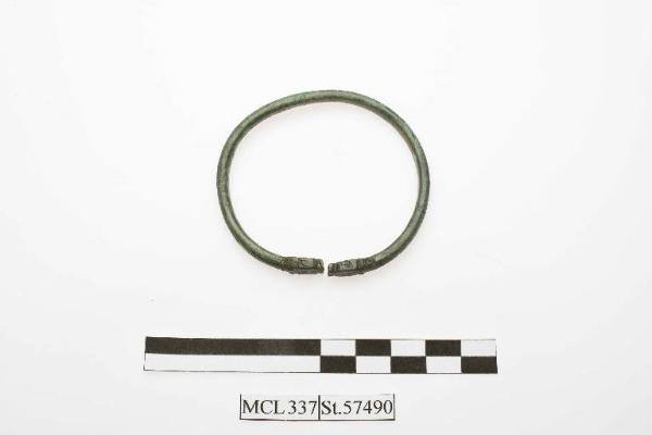 Armilla in bronzo a testa di serpente, sezione quadrangolare ad angoli arrotondati. Le estremità a testa di serpente sono ben modellate e precedute da una decorazione costituita da due fasce convergenti di puntini incisi.