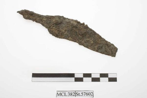 Coltello in ferro, con dorso e lama sinuosi; mutilo della punta e della parte terminale del codolo.