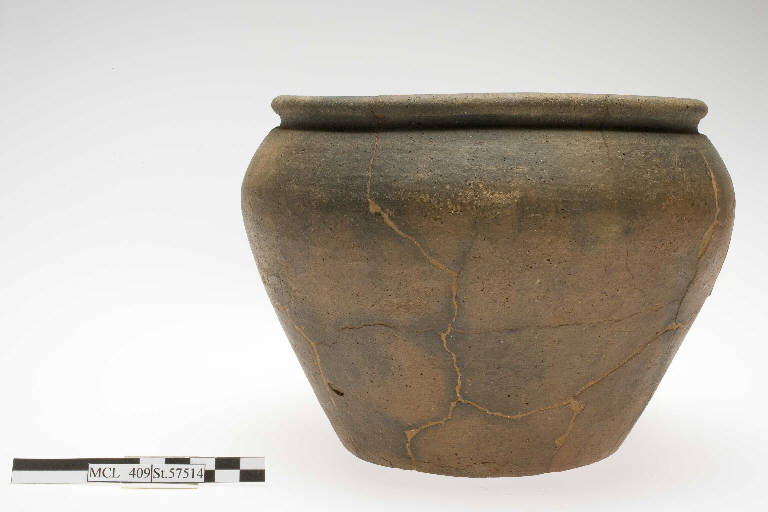 Olla con orlo estroflesso a sezione semicircolare distinto mediante breve gola dal corpo troncoconico, fondo piano.