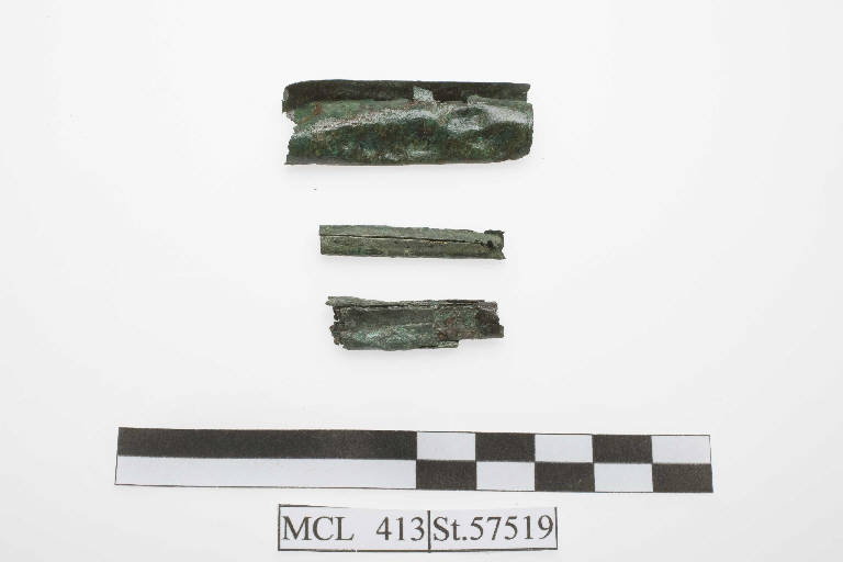 Frammenti di astuccio in sottile lamina di bronzo piegata a cilindro. All'interno dell'astuccio era conservata la laminetta bronzea tutt'ora presente, in origine avvolta nel tessuto. Un'ulteriore lamina bronzea conservata, piegata anch'essa a cilindro, doveva avvolgere la lamina conservata nel tessuto.