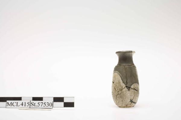 Balsamario in marmo, orlo estroflesso, breve collo distinto mediante due gradini dal corpo cilindrico-ovoidale, bassissimo piede a disco su base concava.