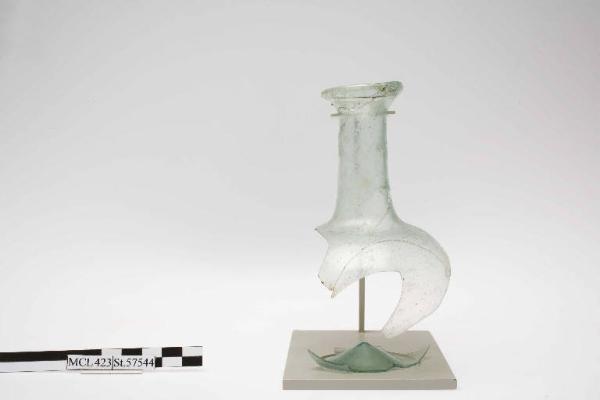 Balsamario in vetro, orlo presumibilmente estroflesso, lungo collo cilindrico appena svasato, corpo globoso, fondo concavo.